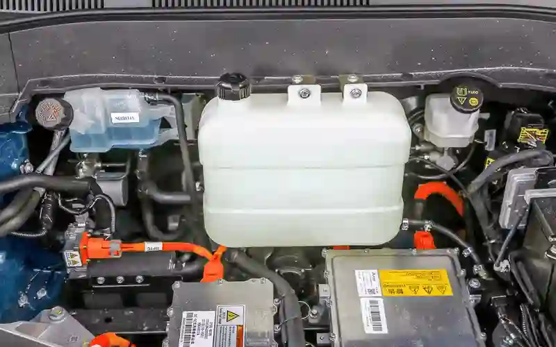 Вам не мерещится: у i‑Joy три расширительных бачка, по одному на каждый контур обогрева. Левый – для мотора и инвертора, средний – для аккумулятора, правый – для салона. Две последние системы сообщающиеся. Когда требуется прогреть батарею, туда направляется подогретый «автономкой» антифриз из салонного контура.