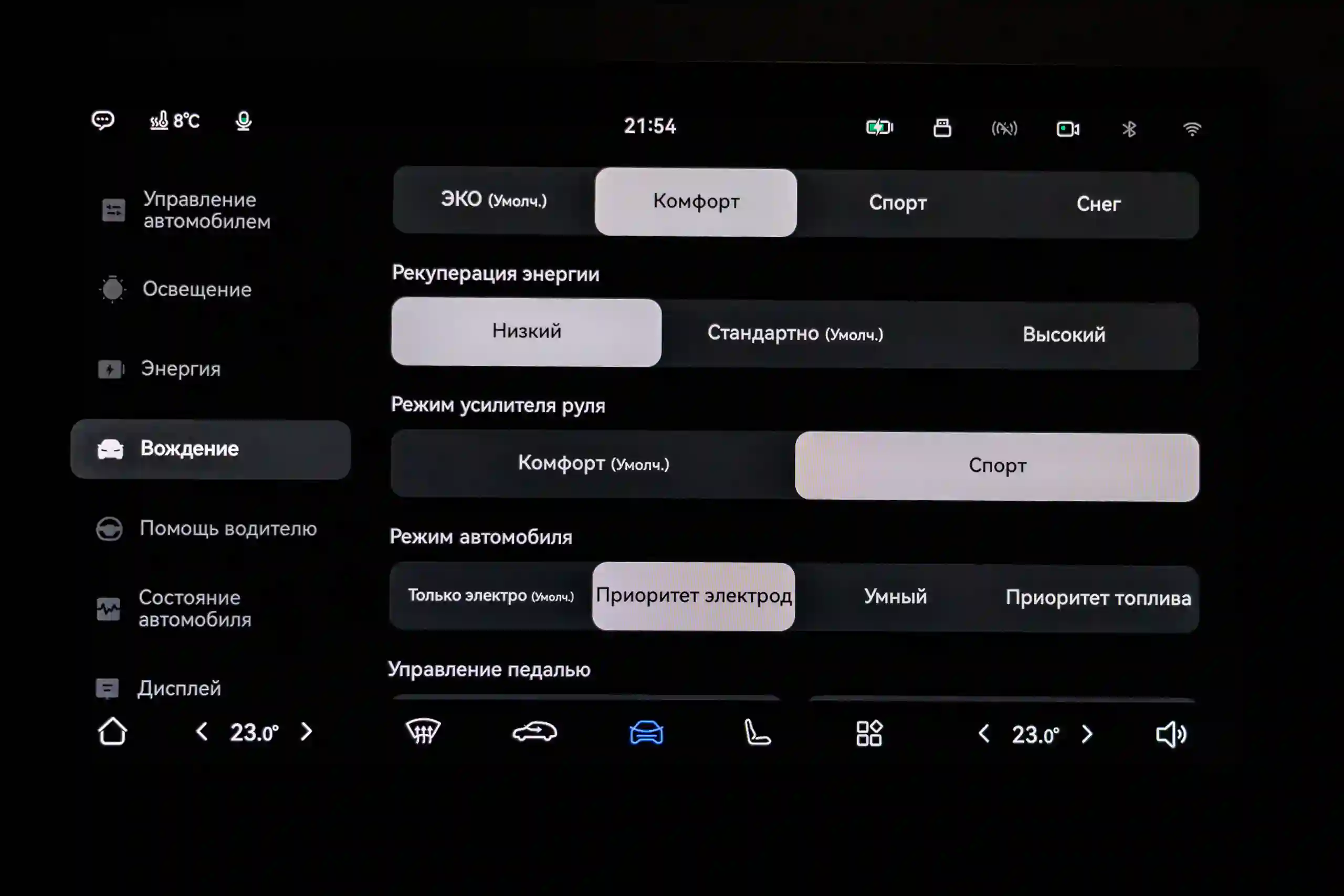 У новой модели в автоматическом режиме тише работает кондиционер и чуть мощнее замедление при стандартном среднем уровене рекуперации. Это может служить объяснением, почему она оказалась экономичнее дорестайлинговой в мерном параллельном заезде в режиме EV при одинаковых настройках. Первая «привезла» расход (по БК) 18,8 кВт·ч/100 км, а старая, обутая в точно такие же шины с тем же давлением — 21,2 кВт·ч/100 км.